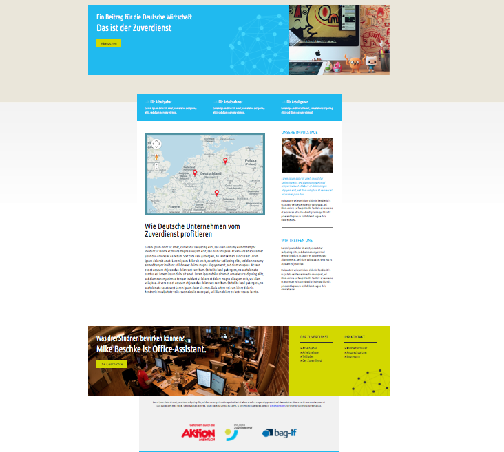 Als zentrale Kommunikationsplattform entschieden wir uns schon früh für eine eigene Projektwebseite. Auf dieser werden in Zukunft alle Kommunikations- und Infomaterialien versammelt sein. Auf der Webseite wird jede Ansprechgruppe etwas für sich finden: Leistungsanbieter laden sich Musterverträge herunter, Leistungsträger informieren sich über Umsetzungsbeispiele in anderen Bundesländern und Leistungsnutzer erfahren über ihre eigenen Anstellungsmöglichkeiten. Darüber hinaus gibt ein Imagefilm, Kartenmaterial und Texte Einblicke in die Hintergründe von Zuverdienst und in seine Bedeutung für das Thema Inklusion in Deutschland.